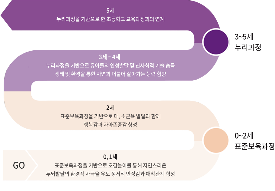 영아에게는 표준보육과정을, 유아에게는 누리과정을 운영하며